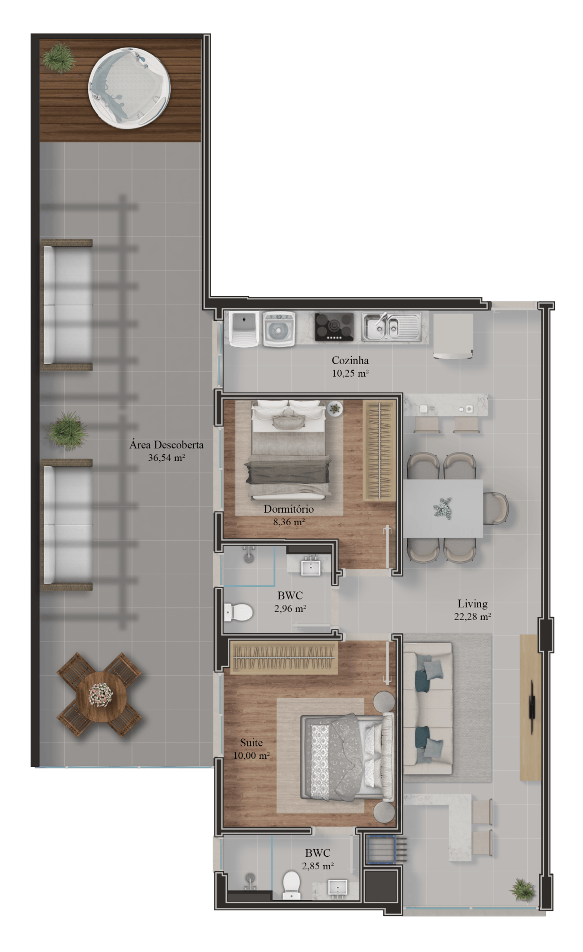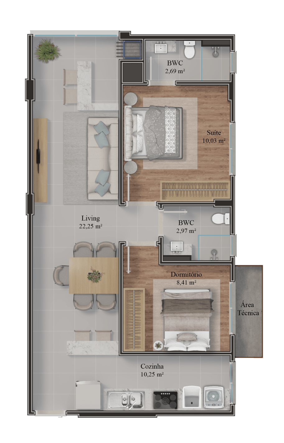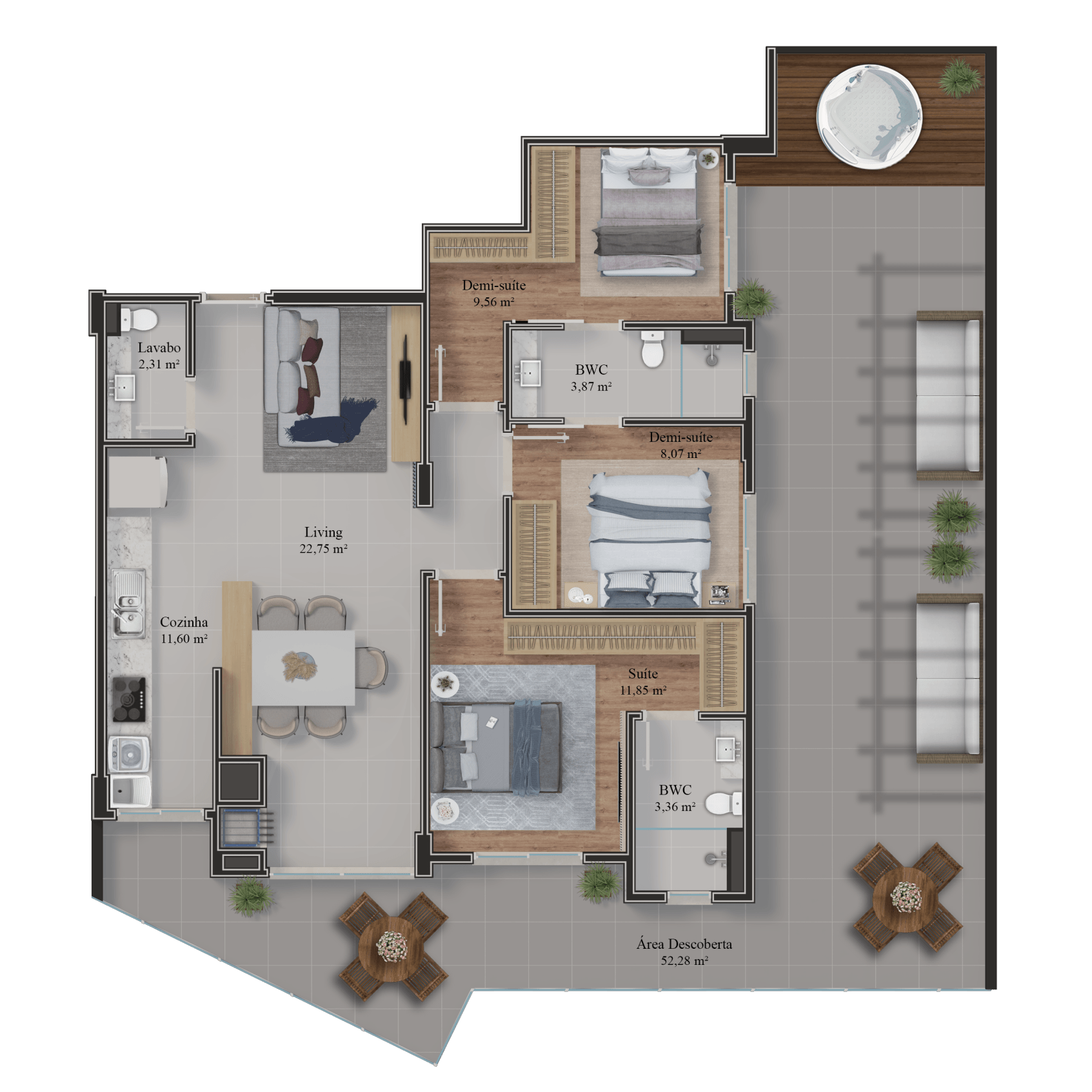 Planta humanizada é uma planta baixa com a adição de texturas, cores, sombras, efeitos, decorações e mobiliários. Ela traz mais clareza a apresentação, facilitando o entendimento do projeto.